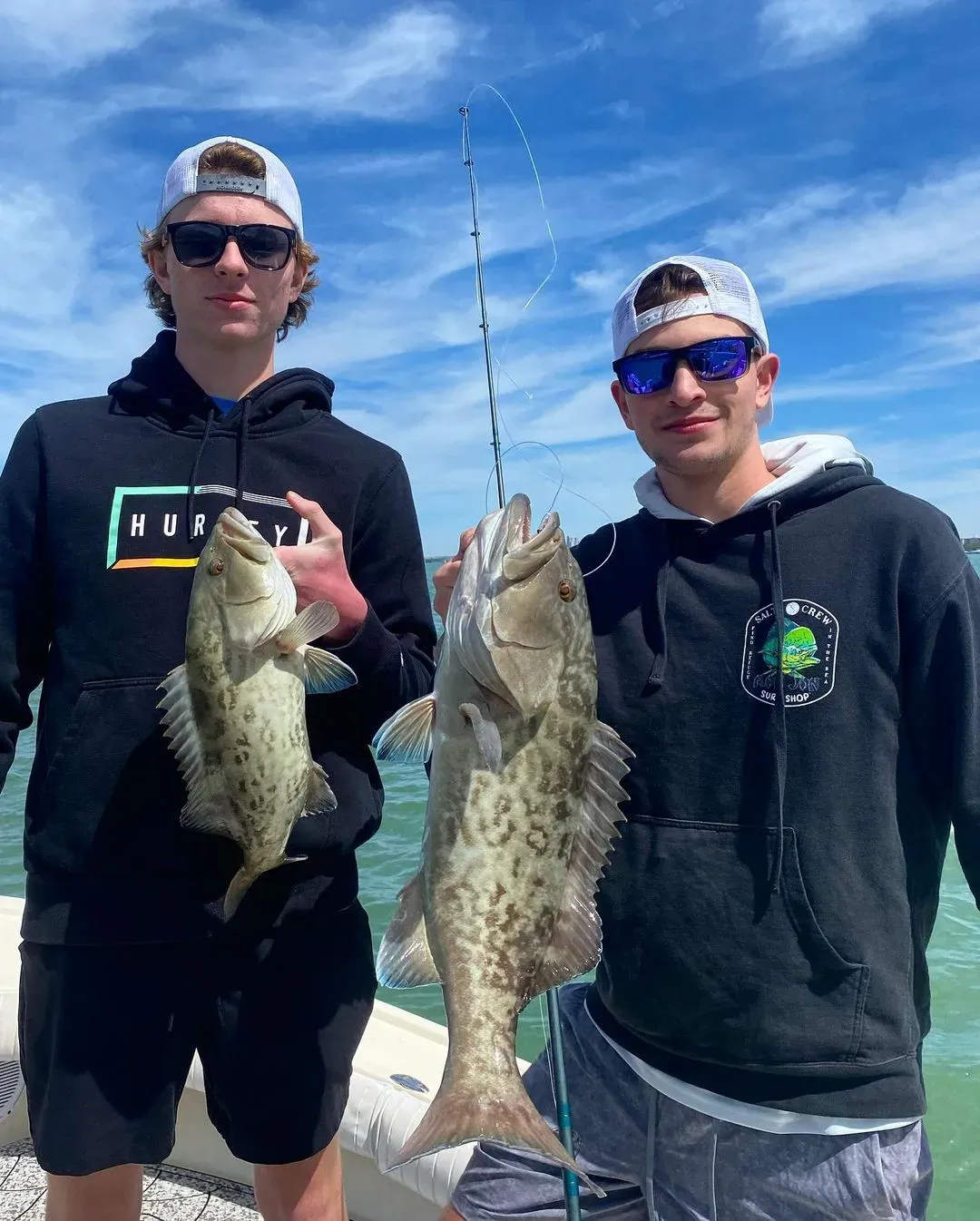 Gag grouper are the bread and butter of Clearwater's nearshore scene, and for good reason. These bruisers can push 20-plus pounds and they know how to use every piece of structure on the bottom to their advantage. They're most active during the cooler months, roughly October through April, when they move into shallower water to feed and eventually spawn. What makes them so exciting to catch is that initial run when you hook one – they'll head straight for the rocks, and it becomes a test of your drag system and your technique. The fight is all about keeping them off the bottom, and when you finally get one boatside, that wide mouth and chunky build tells you exactly why they're such a prized catch around here.